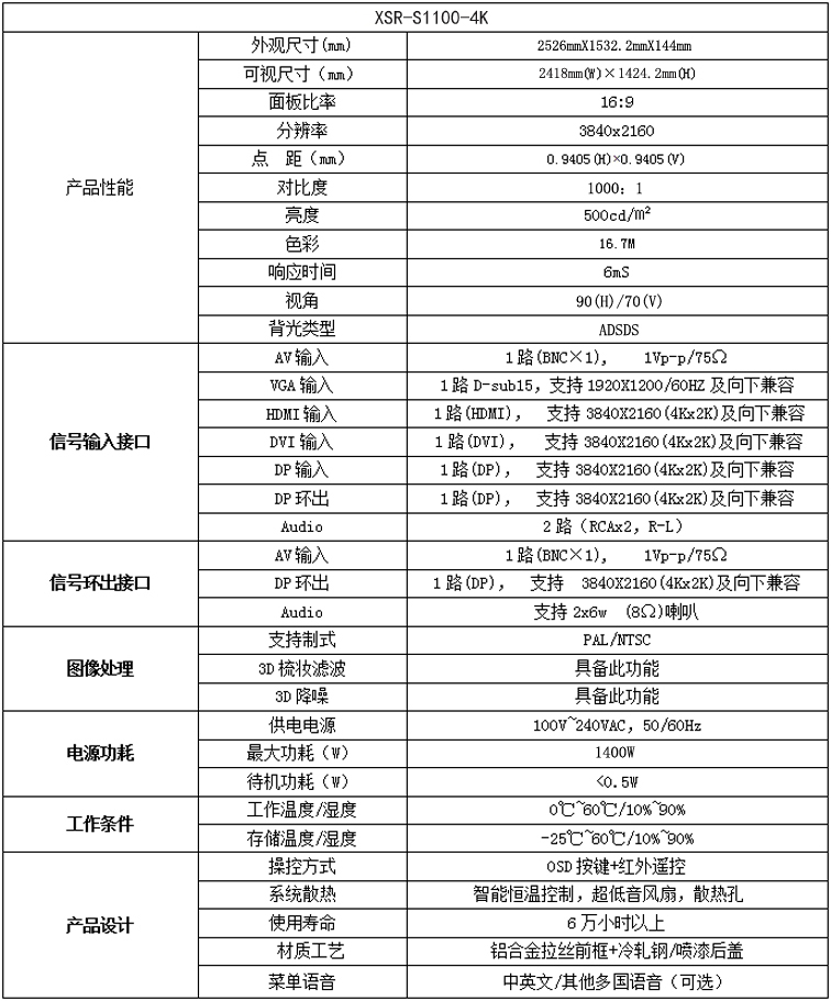 XSR-S1100-4K是新視銳一款1104K超高清液晶監視器,分辨率為3840px ×2160px;其采用國際知名品牌液晶面板(如:LG、三星、夏普等)、頂級元器件材料,支持7x24小時不間斷運行,壽命高達60000小時;其搭載世界先進的視頻圖象處理芯片;自動色彩引擎CMM-6,確保色彩還原達到極至;支持多種信號輸入、環出。